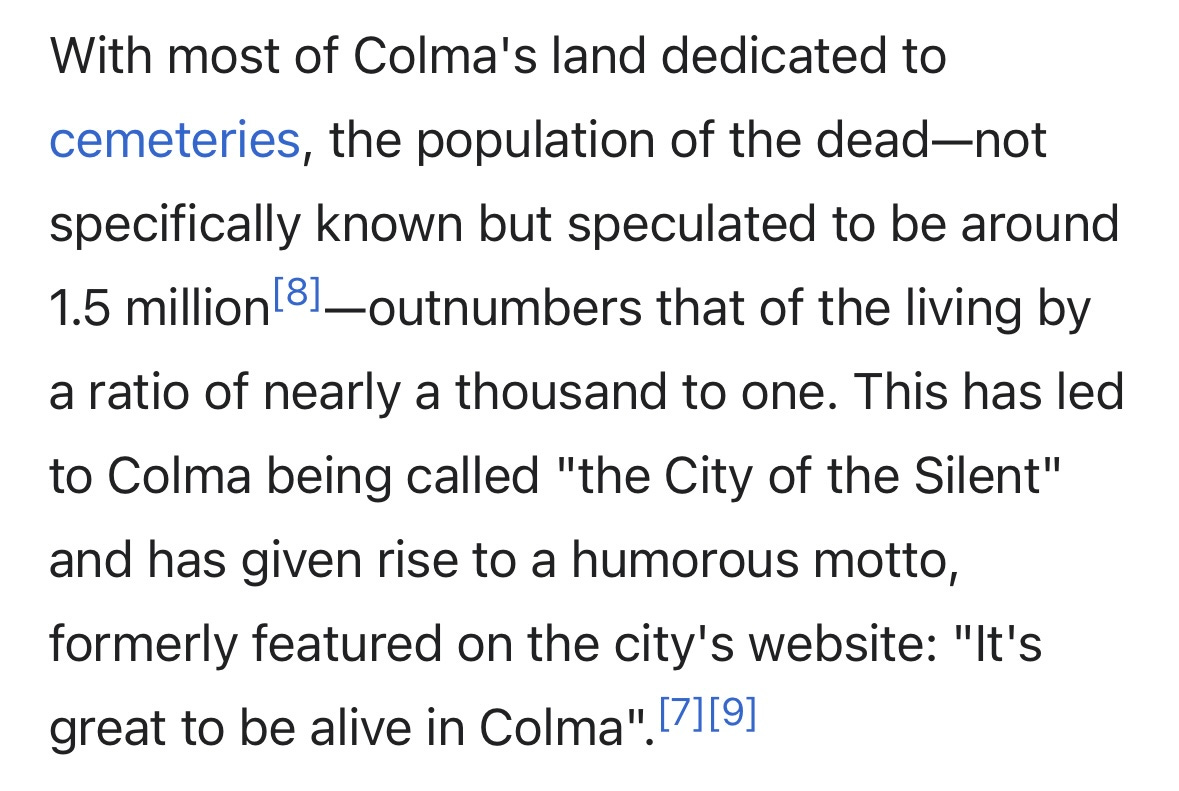 Colma (CA) is a small incorporated town just outside of San Francisco, commonly known as the modern necropolis. It houses about 1500 of the living, and some million and a half of the dead — which makes it rather convenient for the sort of morbid half-jokes that get retracted for controversy as soon as they were made.
